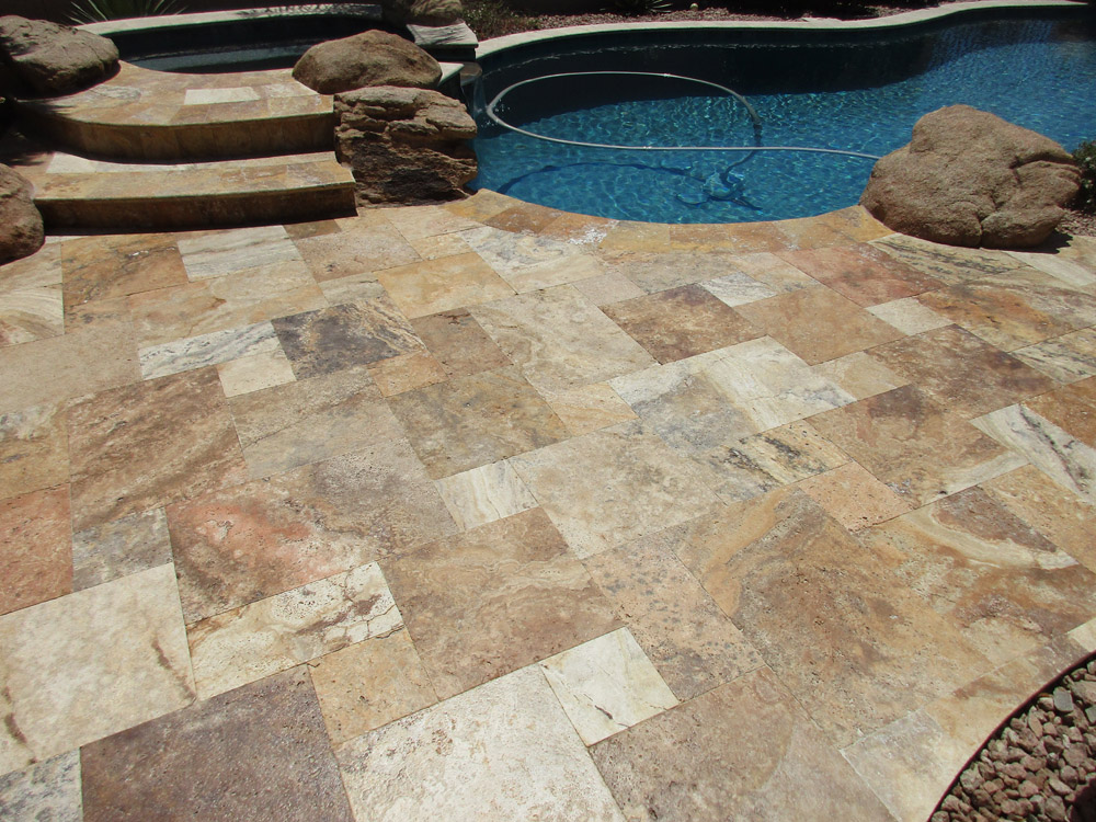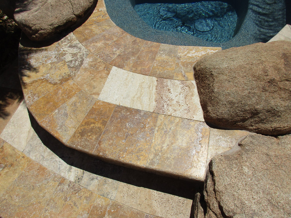 Travertine stone is a porous stone that provides an excellent natural non-slip surface for pools, patios and decks, and it is one of our favorite materials to work with.